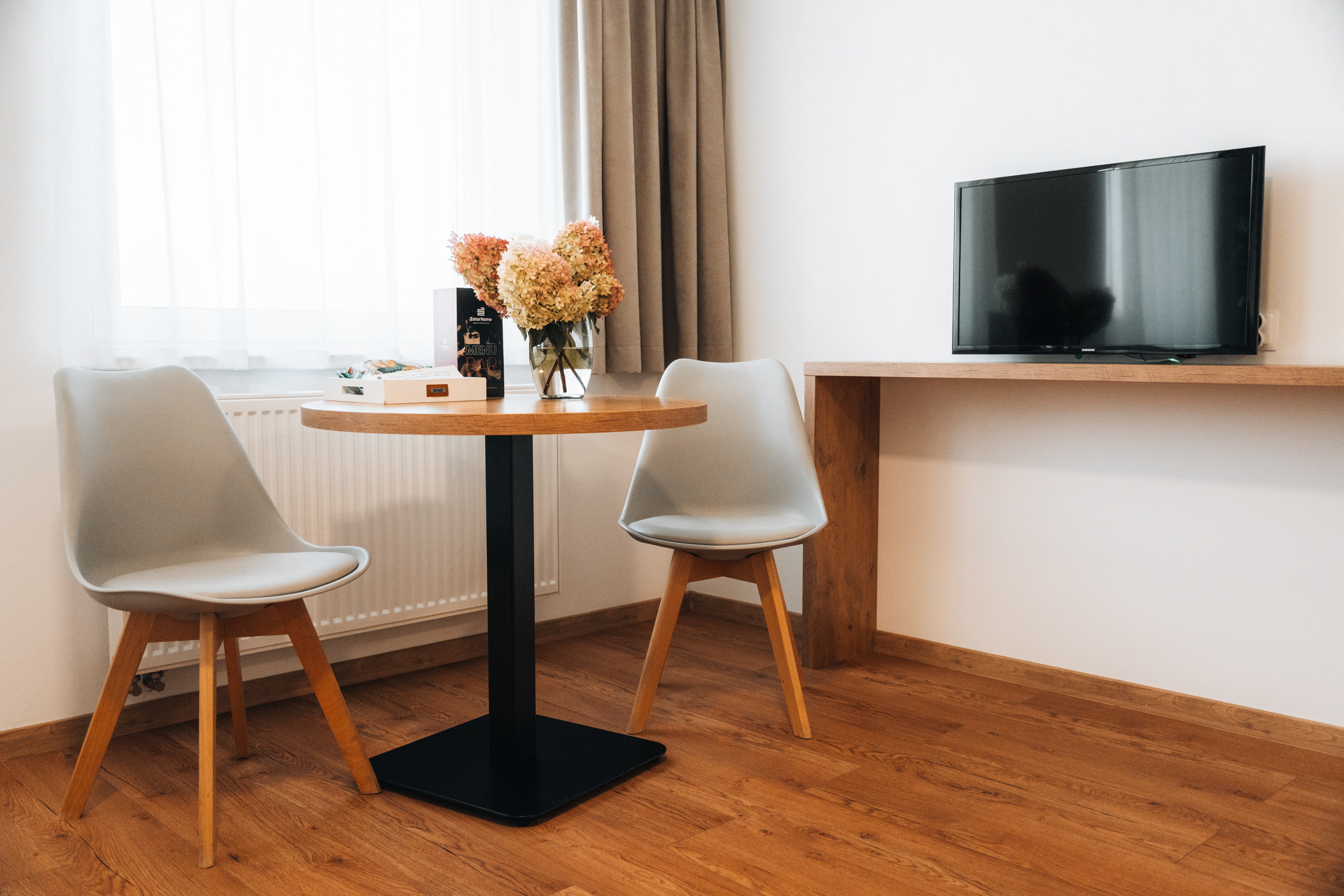 Głównym pomieszczeniem apartamentu jest jasny i przestronny pokój z dużymi oknami. Jego wysmakowane wnętrze urządzone jest w nowoczesnym stylu, o czym świadczy wykończenie ścian oraz meble i dekoracje w najmodniejszym designie. W pokoju znajdziecie Państwo wygodne łóżka z możliwością złączenia oraz telewizor z płaskim ekranem.