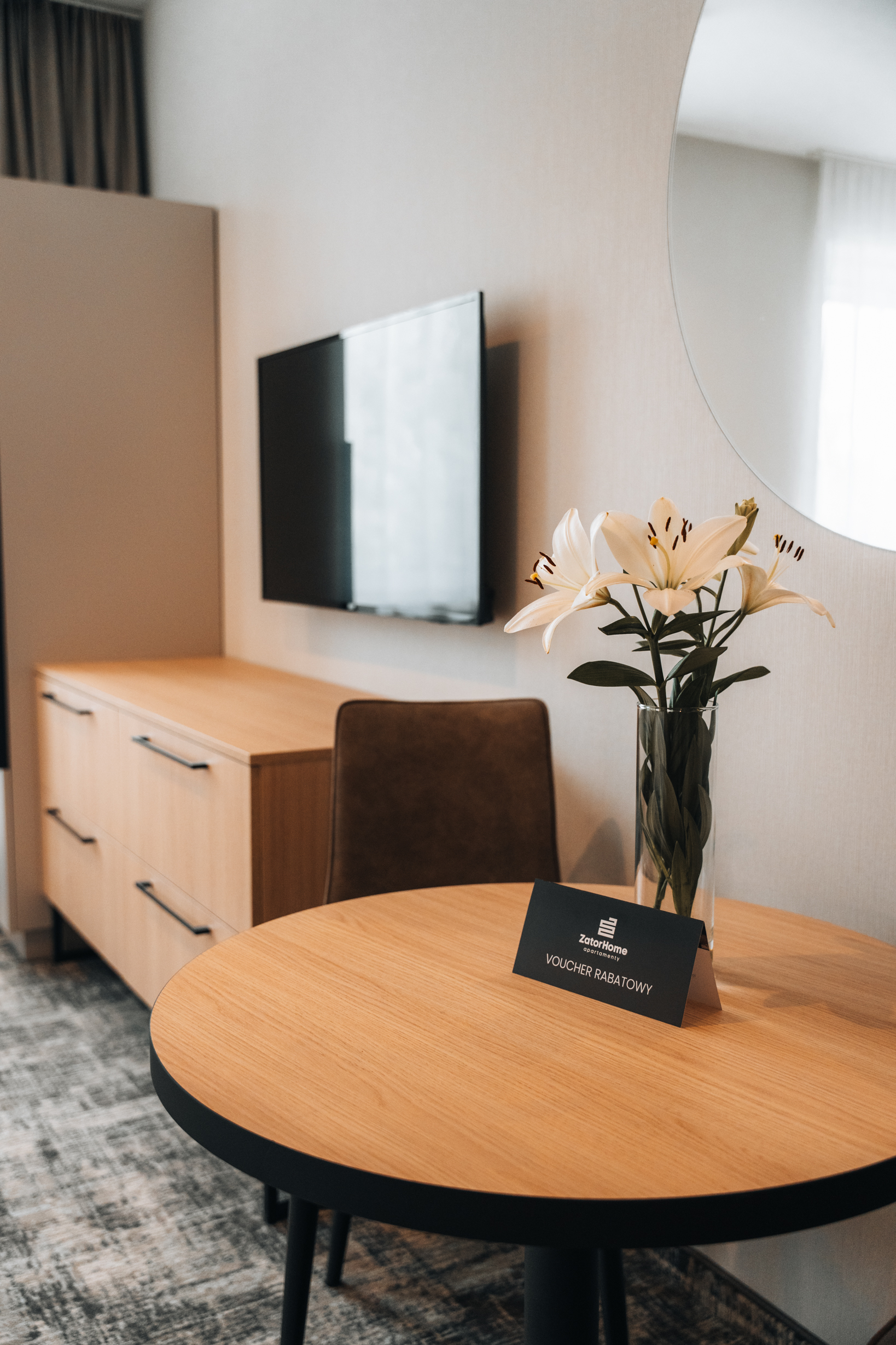 Głównym pomieszczeniem apartamentu jest jasny i przestronny pokój z dużymi oknami. Jego wysmakowane wnętrze urządzone jest w nowoczesnym stylu, o czym świadczy wykończenie ścian oraz meble i dekoracje w najmodniejszym designie. W pokoju znajdziecie Państwo wygodne łóżka z możliwością złączenia oraz telewizor z płaskim ekranem.